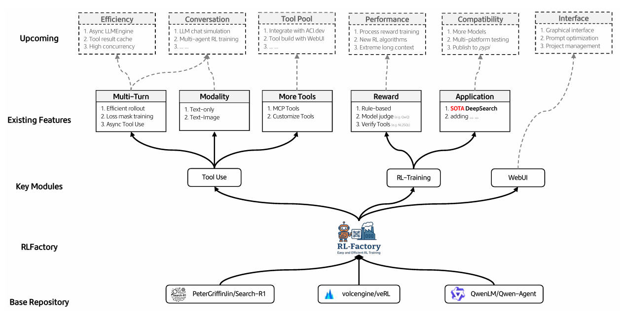 Enter RLFactory: a plug-and-play RL post-training framework built specifically for multi-turn LLM tool use. It removes the friction of environment setup, accelerates training through asynchronous tool calling, and lets you define rewards using rules, models, or tool feedback—all while decoupling the RL engine from your tool logic. If you’re building agents that search, book flights, analyze data, or orchestrate APIs across multiple steps, RLFactory is designed to get you from idea to trained agent faster and with less code.